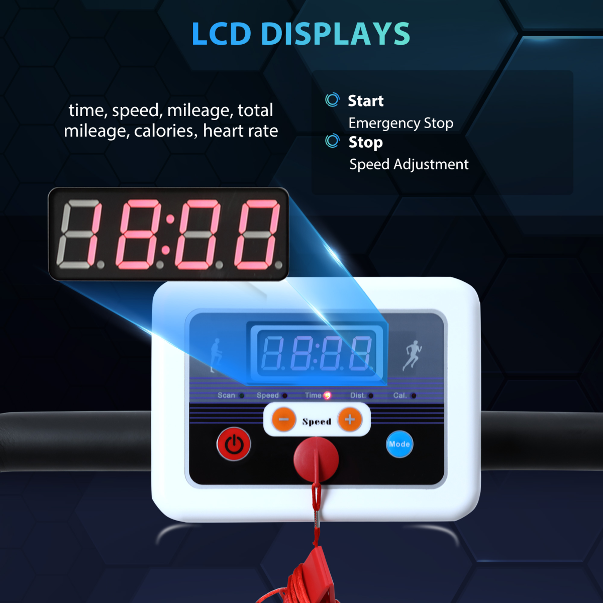 - "1-10Km/h Folding Treadmill Home Running Fitness Machine Safety Stopper HOMCOM" - Description: - "500W ELECTRIC POWERED: 1.25HP Electric treadmill goes up to 10km/h - the treadmills for home is perfect for beginners and is suitable for even advanced runners to keep active. - LCD SCREEN: Keeps you informed of the time elapsed, distance, speed and calories burnt, the folding treadmill allows you to focus fully when working out. - SAFE DESIGN: Built-in safety button on the running machine stops power immediately to prevent accidents. - FOLDABLE: The running machines for home use is easy to fold in seconds and equipped with two wheels to move easily, it is ideal for homes, offices and other spaces with little room to spare. - FOLDABLE TREADMILL DIMENSIONS: 118H x 125L x 61Wcm. Folded: 68H x 125L x 60Wcm. Running mat: 100L x 34Wcm. - MAXIMUM LOAD 110KG.