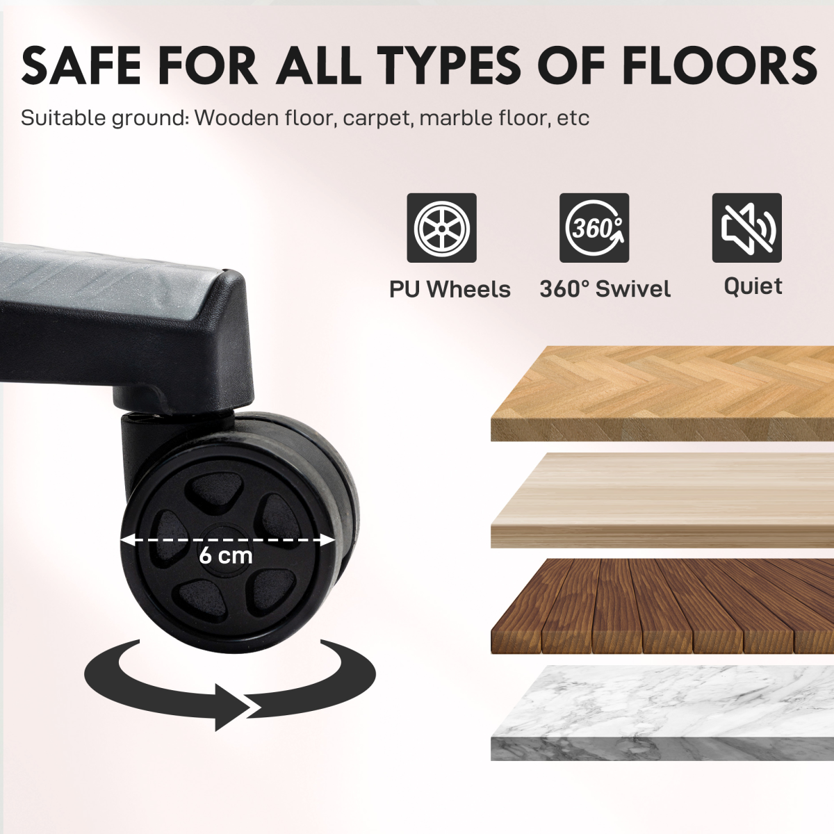 - Swivel seat and smooth, quiet casters ensure easy mobility