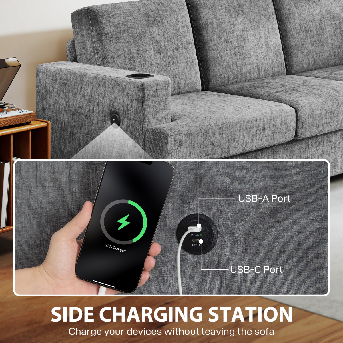 HOMCOM 3 Seater Sofa, Fabric Sofa with USB Ports and Cup Holders, Grey