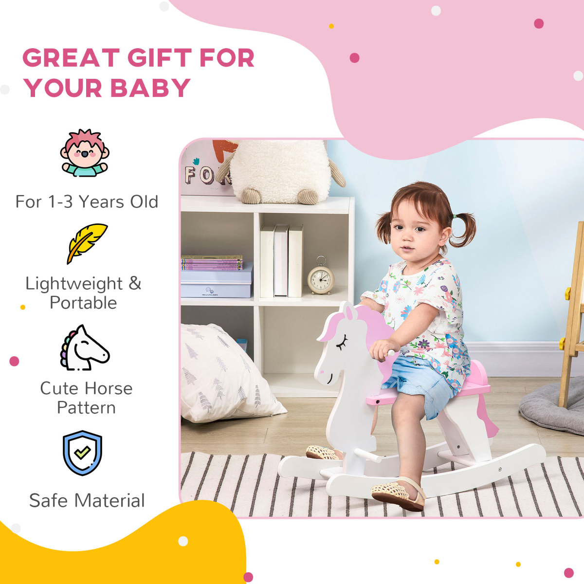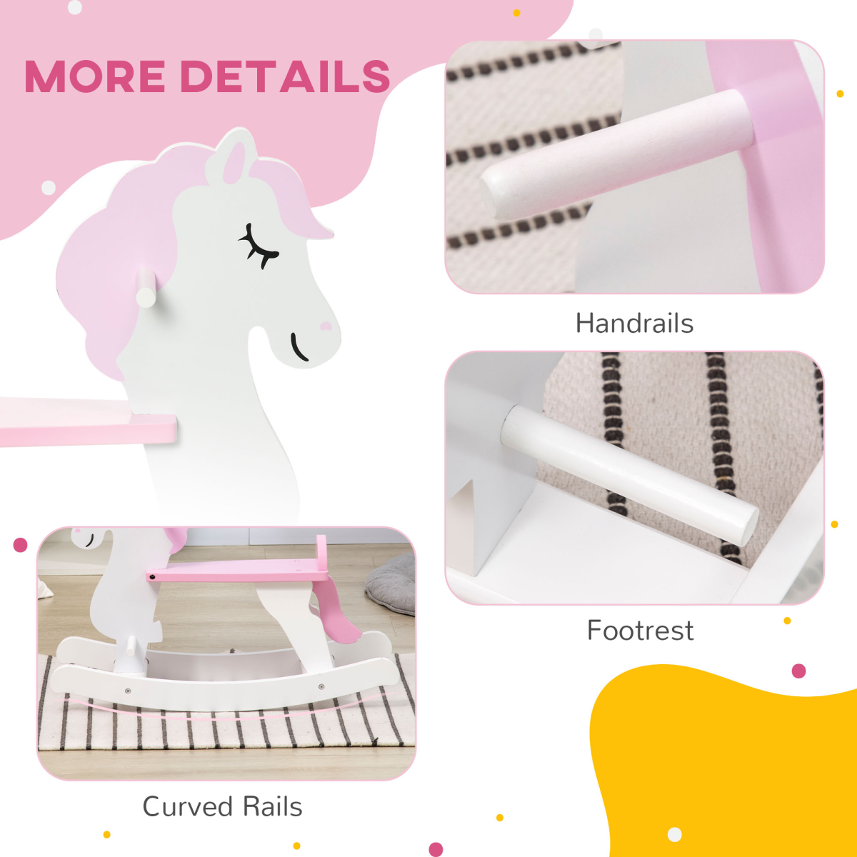 Cute design: A white and pink rocking horse, which will capture your child's imagination when playing. When not in use, it makes a vibrant decoration in their room.Easy to use: This kids rocking horse includes handrails and pedals, whilst the suitable height lets children safely get on and off on their own.Safe material: Made from pinewood and MDF, it's sturdy and strong, supporting your child as they rock back and forth. A smooth surface with round edges, keeping children safe as they play. Two carved rails at the bottom for a gentle rocking motion.Dimensions: 46.5H x 68L x 27Wcm. Suitable age: 1-3 years.Maximum load 50kg. Simple assembly required.