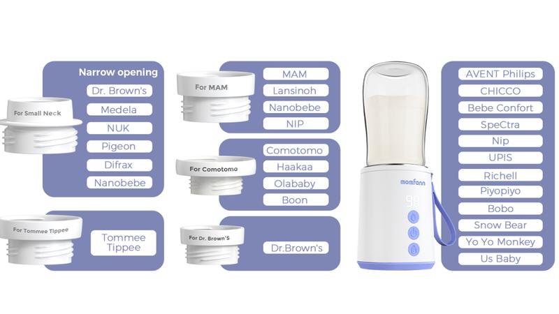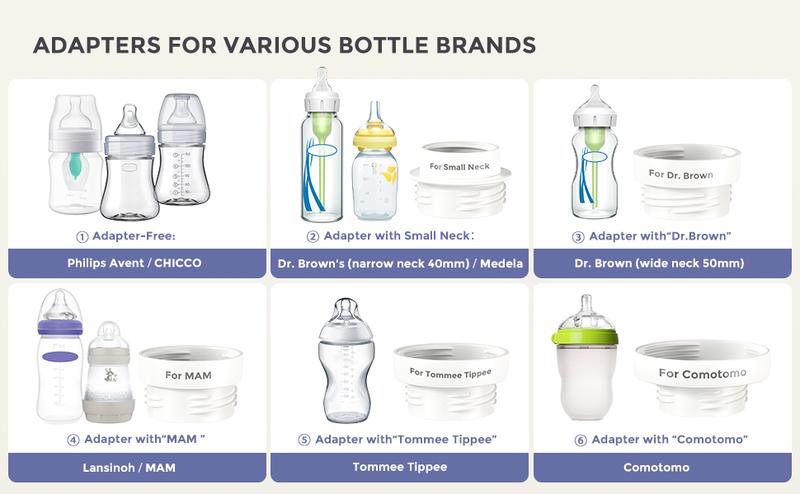 - Compatible with Philips Avent and Chicco without adapter! We put 5 adapters in the package to meet the needs of moms, which also compatible with Dr. Brown Narrow Neck Wide Neck, Medela, Lansinoh, MAM, Comotomo Wide Neck and Tommee Tippee Ultra Wide Neck.