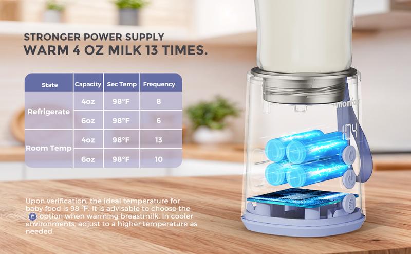 - Designed for effortless travel with its compact, lightweight design. Ideal for backpacks, diaper bags and stroller organizers. Features three 3800 mAh batteries, ensuring you can warm 4 oz of breastmilk or formula to 98°F over 13 times in typical conditions. Please use the charging cable in the package and use a fast charger to ensure the user experience.