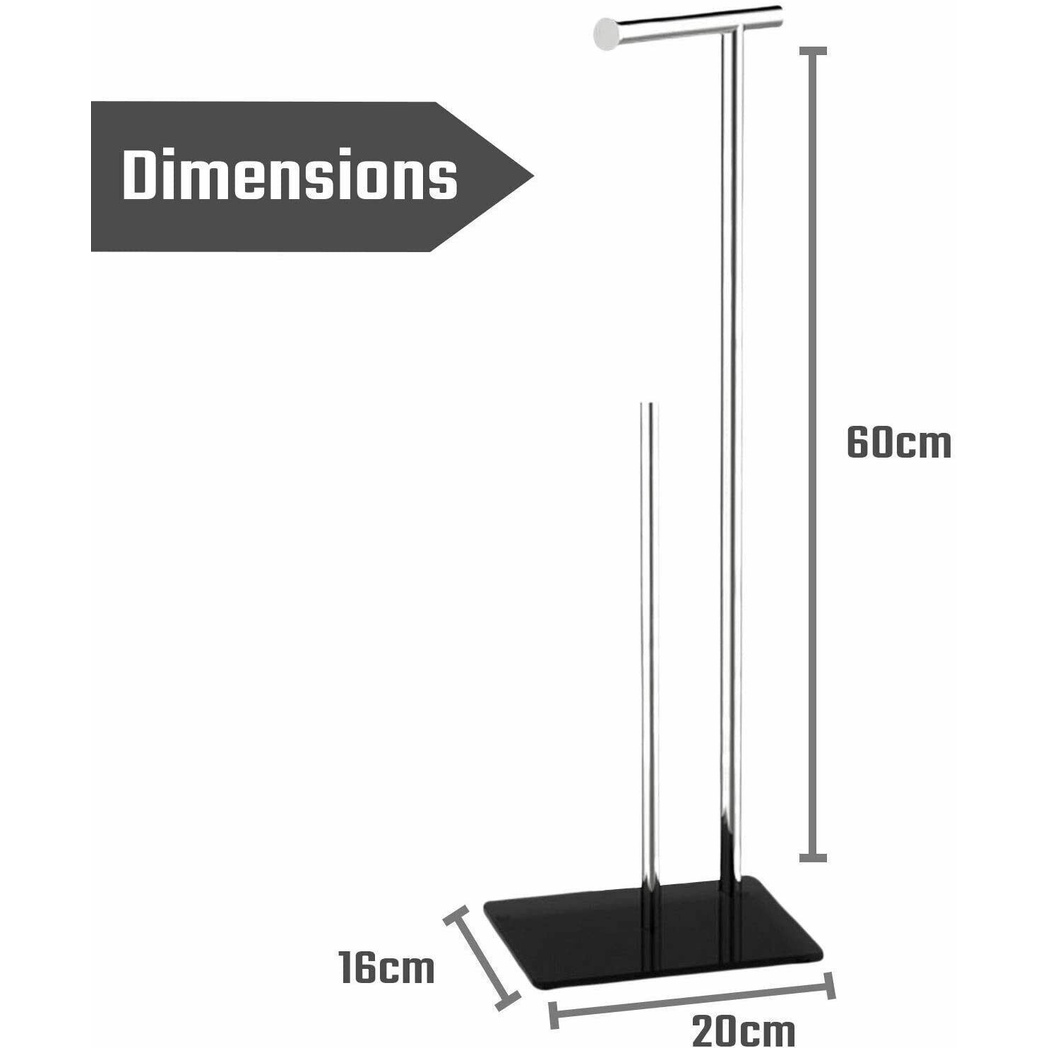 Free-standing toilet roll holder gives a great look to your bathroom Modern and stylish toilet roll holder Provides an extra storage space for additional toilet rolls Stainless steel finish Strong black tempered glass base Non-scratch feet under base to protect floor Do not use abrasive or chemicals when cleaning. DIMENSIONS (approx) 20 CM X 16 CM 60.5 CM