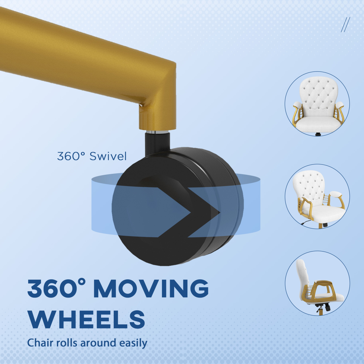 Vinsetto Home Office Chair Button Tufted Desk Chair with Swivel Wheels White Description: - Polished design of velour upholstery with diamante tufting on the back - Frame provides stability and support up to 120kg - Plush all-over padding ensures comfort for hours on end - Ergonomic design of a high and slightly curved back, high-rise armrests and adjustable height and back tilt - 360° swivel base with five castor wheels to move around easily - Assembly required